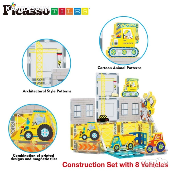 С комплекта магнитни плочки на тема строителство PicassoTiles с превозни средства можеш да строиш и играеш на своя собствена строителна площадка. Този динамичен комплект разпалва креативността и развива фина моторика по ангажиращ начин, въвеждайки те в ранното STEM обучение.