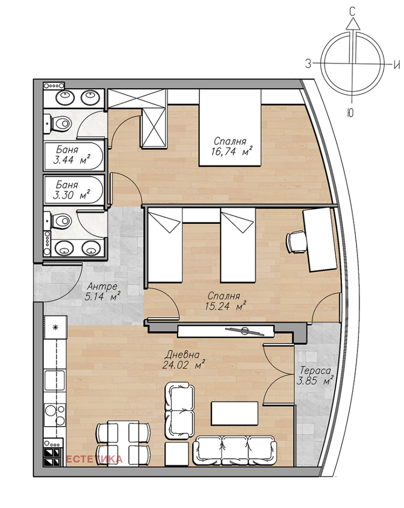 Агенция естетика има удовоствието да Ви представи апартамент 11 находящ на 2-ри жилищен етаж в сграда с асансьор и луксозни общи части. Апартамента е светъл и функционален с източно изложение. На горния и долен етаж апартаментите имат същотото разрпределение и 2-та са свободни.Състоят се от антре, дневна с кът за сядане, кухненски бокс, трапезария- която има поглед към остъклена тераса 4м2, 2 големи спални 15 м2 и 17 м2 с дрешник и 2 бани.