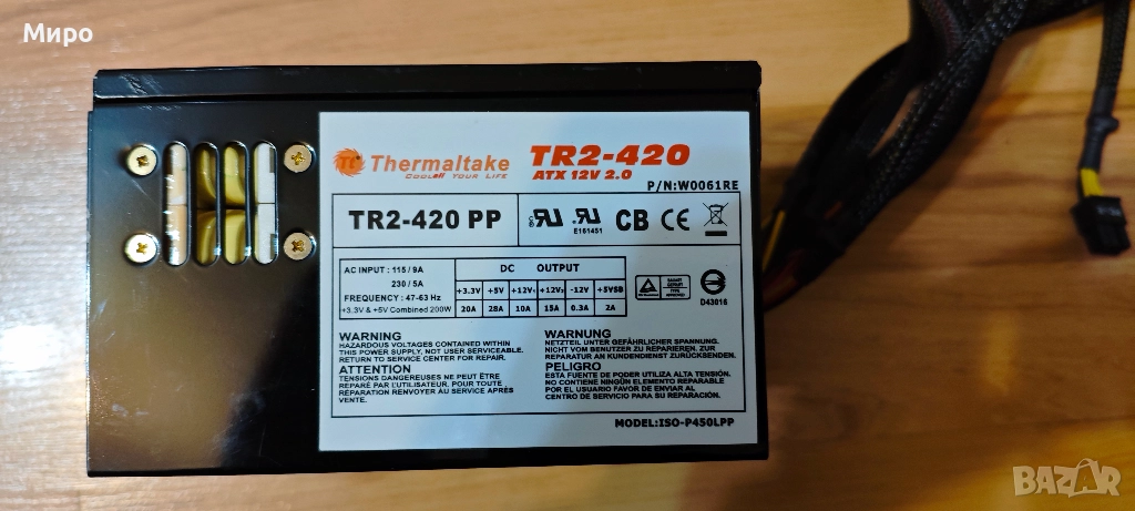 8. Захранване - 420 W Thermaltake TR2, 120 mm. FAN, екранирани кабели, 24-pin за дъното x1, 4-pin (12V) за процесора x1, 4-pin за хард дискове, DVD устройства и други x8, 4-pin за Floppy диск x2, 5-pin SATA Connector за хард диск x2, 6-pin PCI Express Connector x1,Функция PFC, подобрена енергийна ефективност и намалено токово натоварване на системите за захранване с променлив ток. Нискошумен 12-сантиметров вентилатор и корпус с огледален ефект. Защити срещу входна защита, претоварване, пренапрежение, късо съединение и работа без товар.