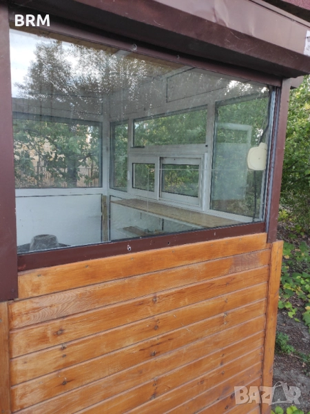 Алуминиев павилион с размер 210х140см . облицован с ламперия.3бр. Алуминиеви ролетни щори,стъклопакети,инсталация,контакти,осветление вътрешно и външно.Подсилен под.4 бр. Въртящи колела.Кука за закачане за лесно изтегляне.Много лесен за местене и транспортиране.При необходимост стъклата,(стъклопакетите) се свалят много лесно с няколко движения.