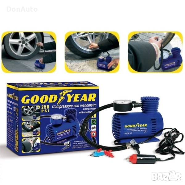 Преносим компресор за гуми с манометър GOODYEAR STRONG 12V 250PSI (12 ATM) + 3 накрайника