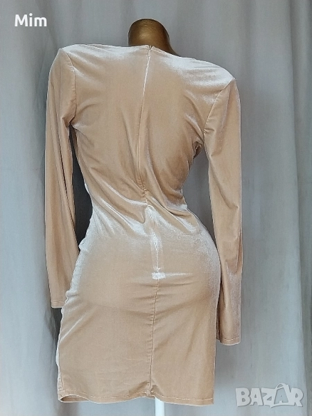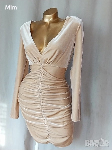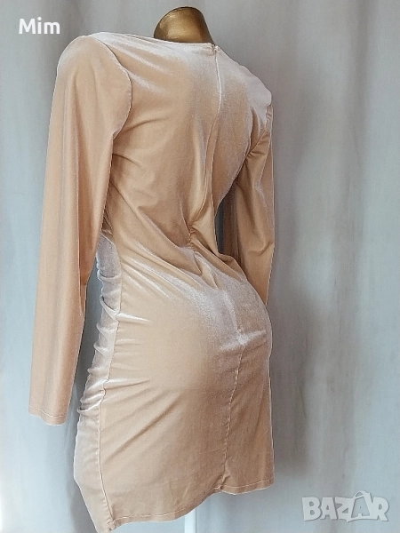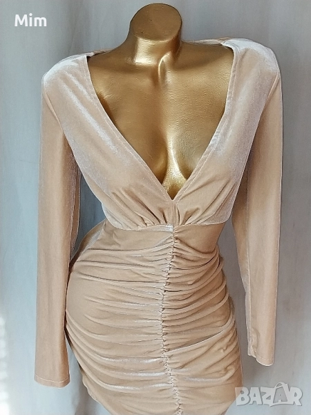 Рокля цвят шампанско с дълъг ръкав отпред набрана ,от еластично финно кадифе ,закопчаването е отзад с цип, гръдна 100 до 115 см еластичност, талия 70 до 80 см еластичност, дължина 85 см ,дължина на ръкавите 58 см Неразличима от нова без хартиен носител.