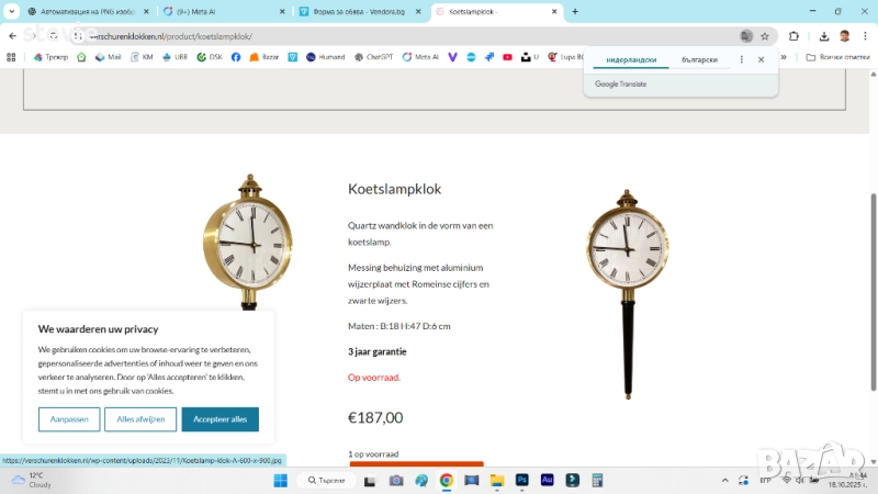 Немски месингов часовник с размери 47 см височина - на самият часовник - 18 см. диаметър.