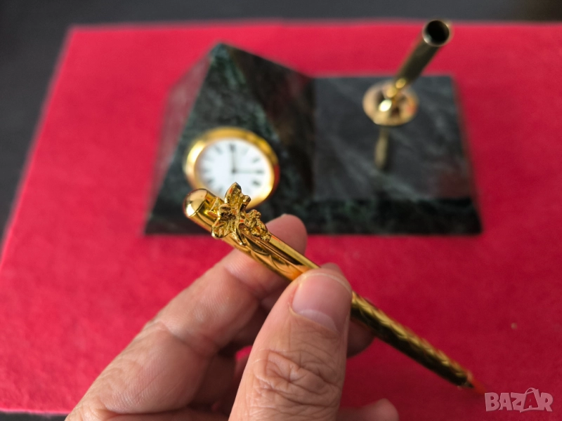 Масивна поставка за бюро от зелен мрамор, с часовник и химикал на стойка.