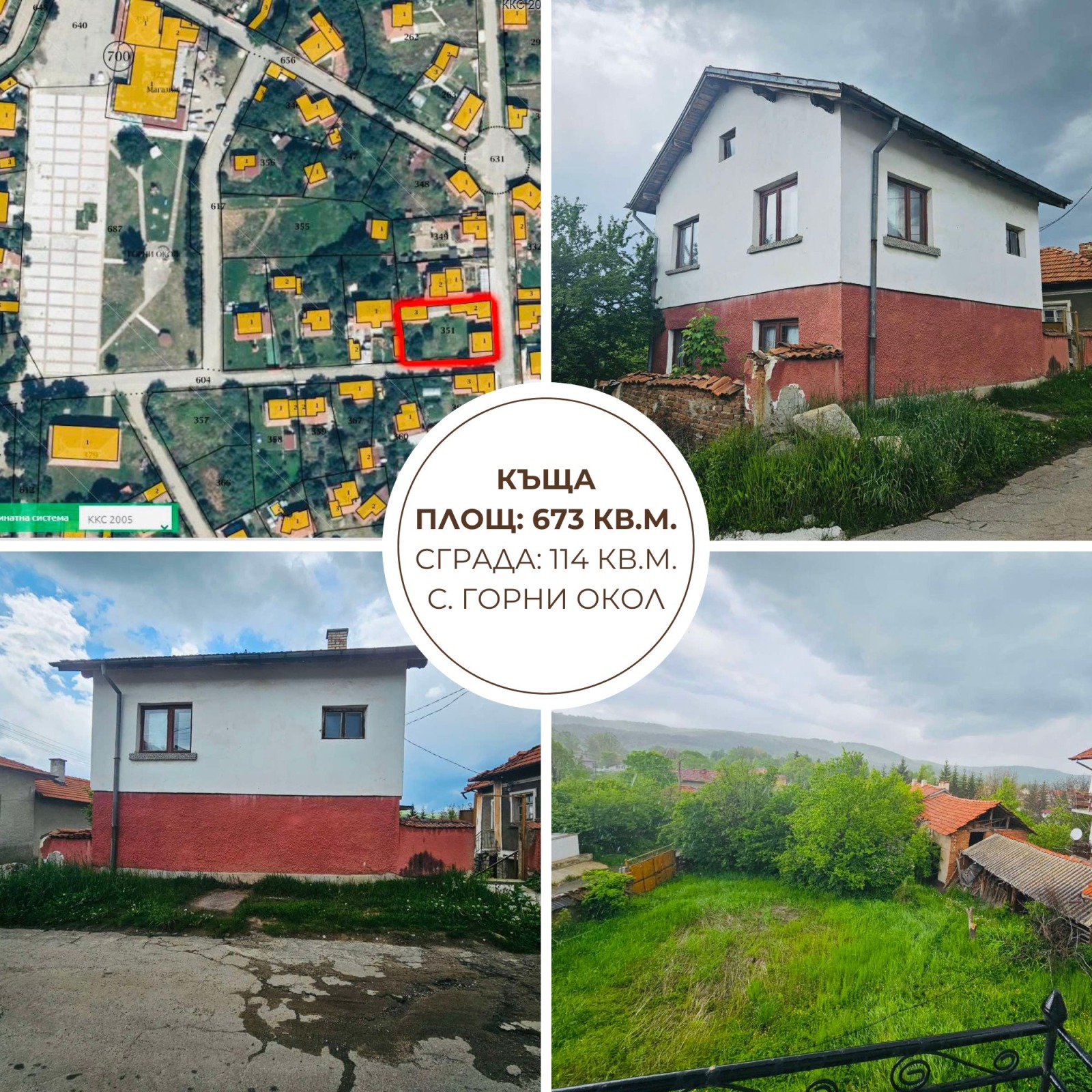 Представяме ви просторен имот, разположен в живописното село Горни Окол, само на 50 км (около 40 минути) югоизточно от София и на 18 км от Самоков и Боровец. Селото е разположено в Плана планина, на 1000 м надморска височина, предлага чист въздух и спираща дъха гледка към Рила. Имотът се намира в непосредствена близост до центъра на селото и е достъпен чрез асфалтов път.