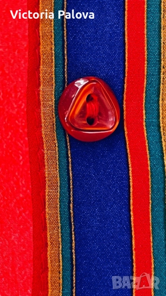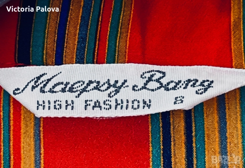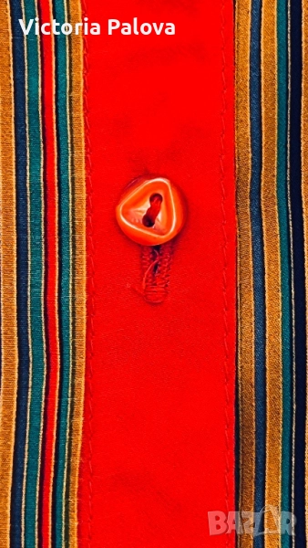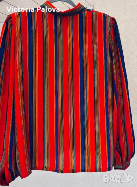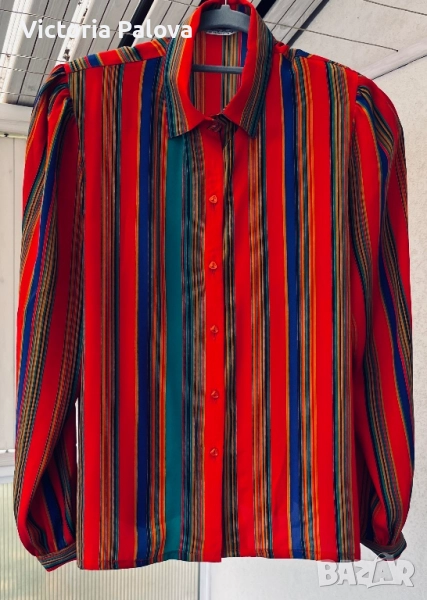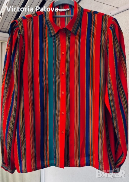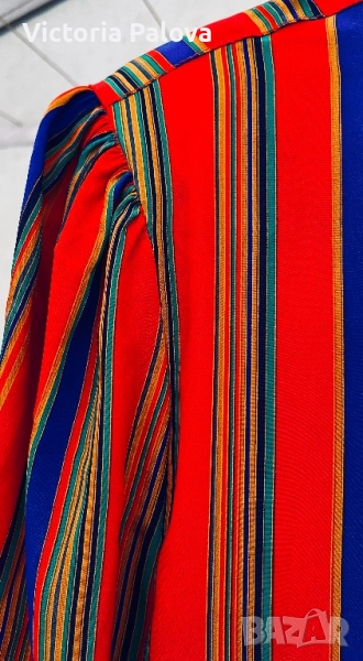 Maepsy Bang риза - експлозия от цветове и стил от високата мода. Комбинацията от вертикални райета в огненочервено, дълбоко синьо, свежо зелено, топло жълто и оранжево създава неповторим впечатляващ модерен чар. Триъгълните копчета са изработени специално за ризата - малки, изящни акрилни бижута. Материята напомня тежка коприна ( няма етикет). Рамо - 42см, ГО - 52см, дължина - 62см, ръкав - 60см.