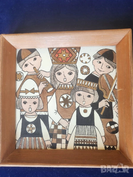 1. ръчно рисувана керамическа плочка - фигури с народни носии - в рамка за окачване на стена.