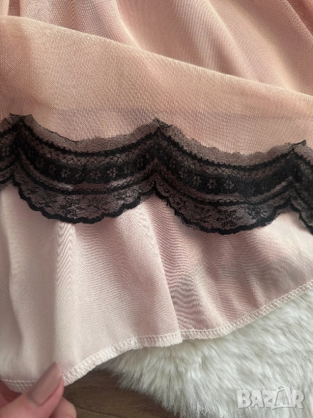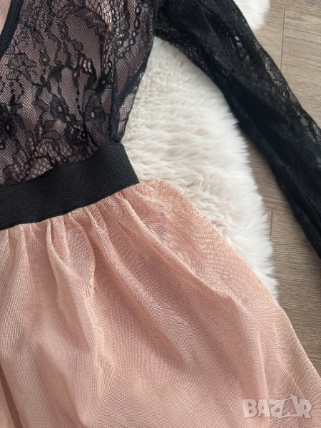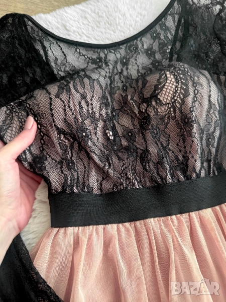 Кокетна къса рокля с черна дантела и тюл в цвят пепел от рози, с ластик на талията, подплънки и подплата. Размер ХС.