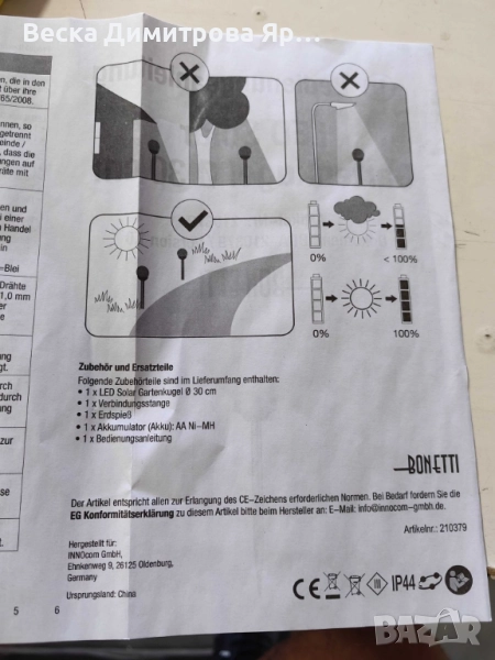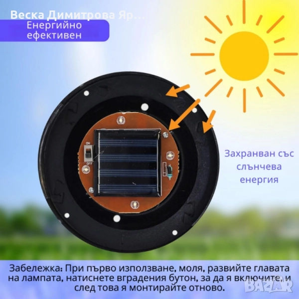 Захранване: вграден соларен панел + акумулатор AA Ni-MH (включен);