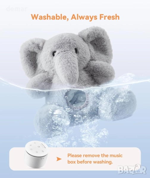 Този плюшен слон съчетава пухкав компаньон с успокояваща машина за бял шум, предлагаща 21 успокояващи звука, включително приспивни песнички, природни тонове и сърдечен ритъм с регулируема сила на звука за спокоен сън и релаксация. Той позволява на родителите да записват персонализирани съобщения или приспивни песнички, за да успокоят бебето си, дори когато е разделено, насърчавайки самоуспокояването и емоционалната сигурност. Проектиран за практичност, той разполага със сваляем калъф, който може да се пере в пералня, акумулаторна батерия и предпазна детска ключалка, което го прави едновременно удобен и сигурен. Достатъчно компактен за кошара или количка, той е идеален за дома или пътуването. В комплект с карта за осиновяване, той служи както като успокояващо помощно средство за сън, така и като смислен подарък за нови родители и техните малки деца.