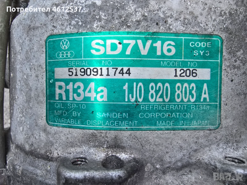 Компресор климатик за VW Bora Golf 4 1.9 TDI Фолкслаген Голф/Бора/Сеат/Шкода/Ауди 1.9 ТДИ 1J0820803A, снимка 1 - Части - 52098327 Компресор климатик за VW Bora Golf 4 1.9 TDI Фолкслаген Голф/Бора/Сеат/Шкода/Ауди 1.9 ТДИ 1J0820803A, снимка 2 - Части - 52098327 Компресор климатик за VW Bora Golf 4 1.9 TDI Фолкслаген Голф/Бора/Сеат/Шкода/Ауди 1.9 ТДИ 1J0820803A, снимка 3 - Части - 52098327 1/3