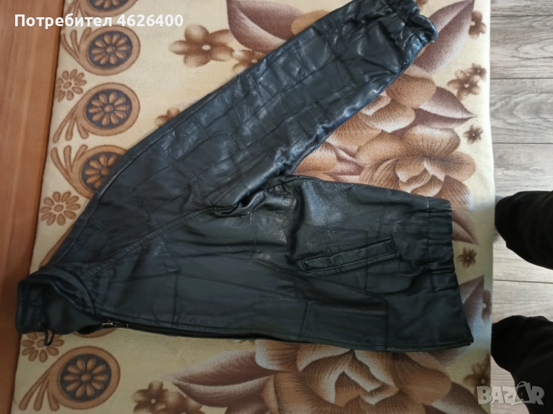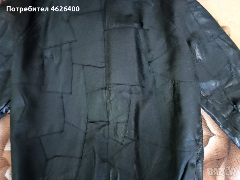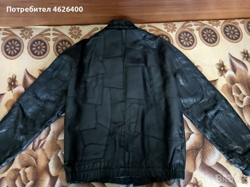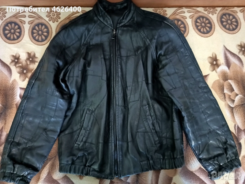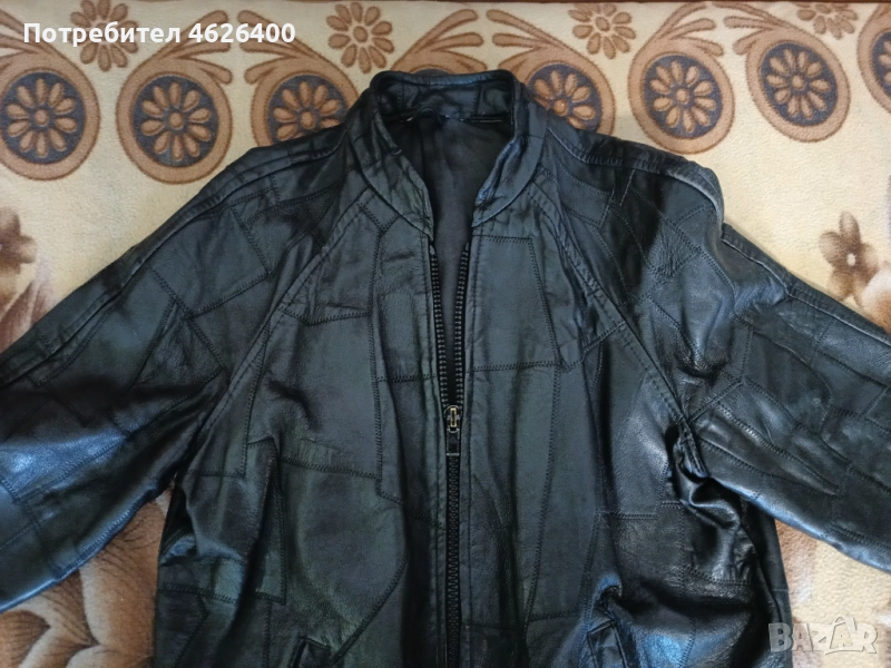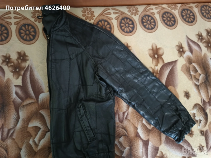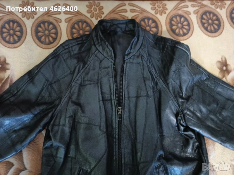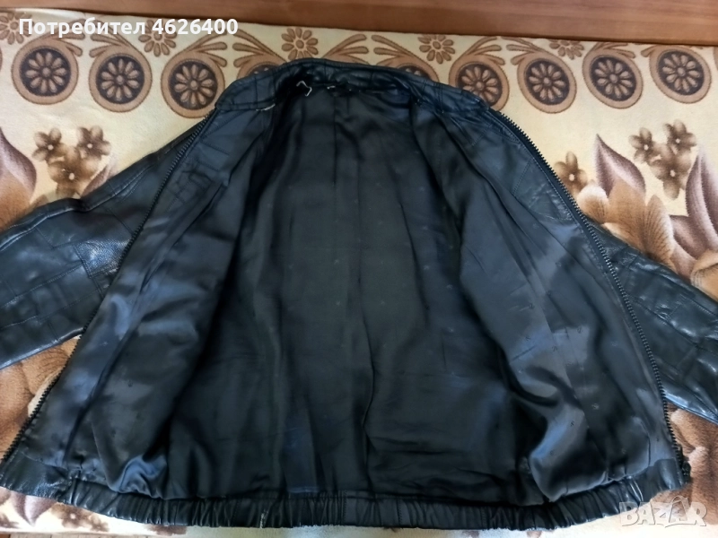 Якето е от естествена кожа,има хастар,модерна визия ,модел с кръпки,подходящо за мотористи и рокери.Може само да се поднови като се боядиса с черна боя.Размери измерени от мен са-дължина-67 см.,дължина на реглан-ръкавите -77 см.,широчина под мишниците-54 см.