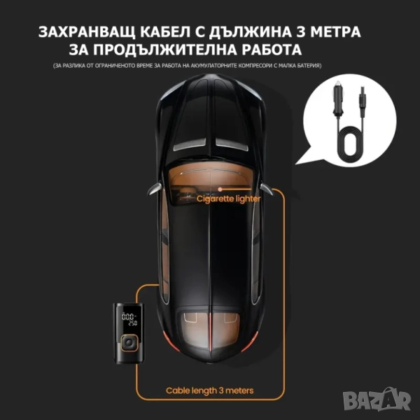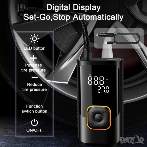 Компресор за гуми, захранване от гнездото за запалка - компактен и мощен, с интелигентно автоматично управление.