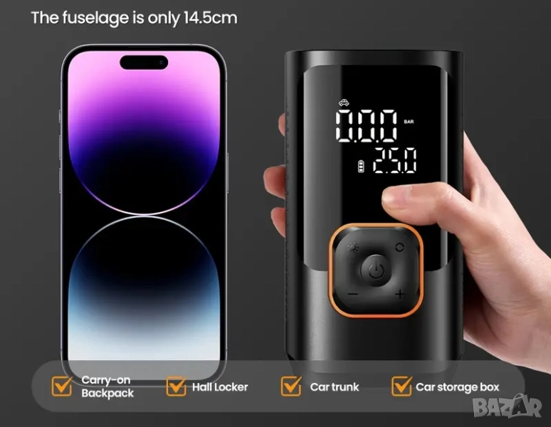 Компресор за гуми, захранване от гнездото за запалка - компактен, мощен, интелигентен , снимка 1 - Аксесоари и консумативи - 52099083 Компресор за гуми, захранване от гнездото за запалка - компактен, мощен, интелигентен , снимка 2 - Аксесоари и консумативи - 52099083 Компресор за гуми, захранване от гнездото за запалка - компактен, мощен, интелигентен , снимка 3 - Аксесоари и консумативи - 52099083 Компресор за гуми, захранване от гнездото за запалка - компактен, мощен, интелигентен , снимка 4 - Аксесоари и консумативи - 52099083 Компресор за гуми, захранване от гнездото за запалка - компактен, мощен, интелигентен , снимка 5 - Аксесоари и консумативи - 52099083 Компресор за гуми, захранване от гнездото за запалка - компактен, мощен, интелигентен , снимка 6 - Аксесоари и консумативи - 52099083 Компресор за гуми, захранване от гнездото за запалка - компактен, мощен, интелигентен , снимка 7 - Аксесоари и консумативи - 52099083 1/7