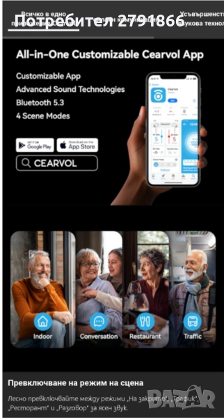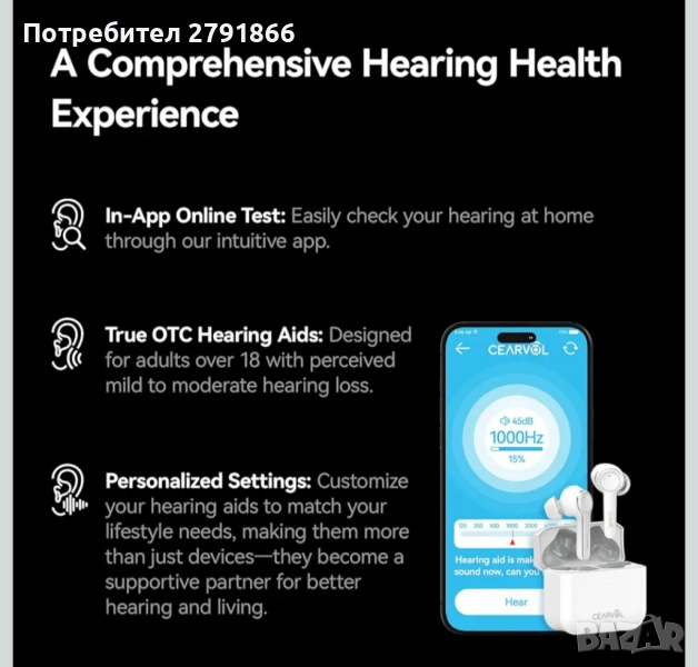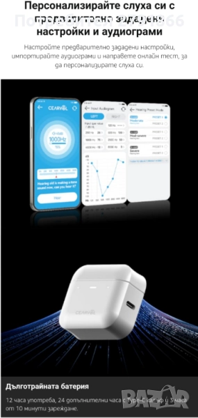 - ПЕРСОНАЛИЗИРАНО СЛУХОВО ИЗЖИВЯВАНЕ чрез ПРИЛОЖЕНИЕ: Приложението Cearvol дава възможност на потребителите да персонализират слуховите си апарати без усилие. Можете да импортирате аудиограми за прецизни настройки, да променяте предварително зададени настройки в приложението или да направите онлайн тест, за да настроите фино слуховия си профил за различни настройки. Тази гъвкавост позволява бързо адаптиране към индивидуалните предпочитания и промените в околната среда.