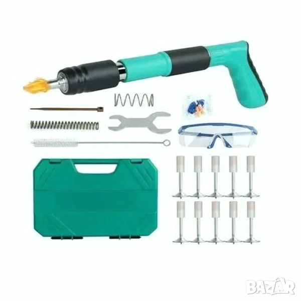 Продава се отделно и нов ръчен пистолет за забиване на пирони в дърво, бетон, метал, керамика и др. с включени 50 броя прави пирони - Модел 1. Последната снимка. ЦЕНА 17.50 евро Пистолет и пирони общо. Комплект с Предпазни очила, консумативи, Куфар-