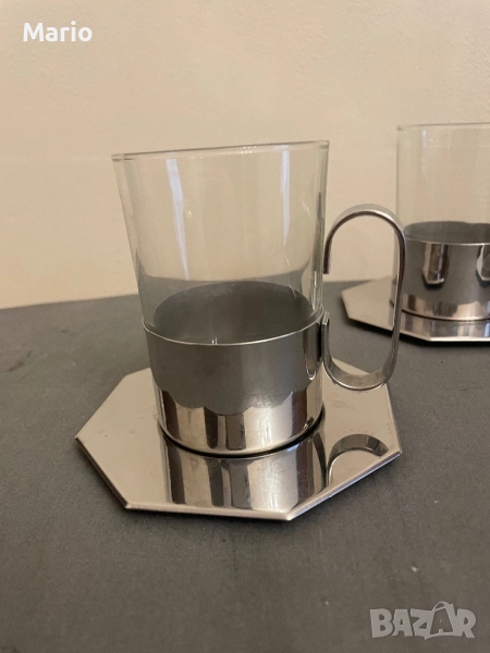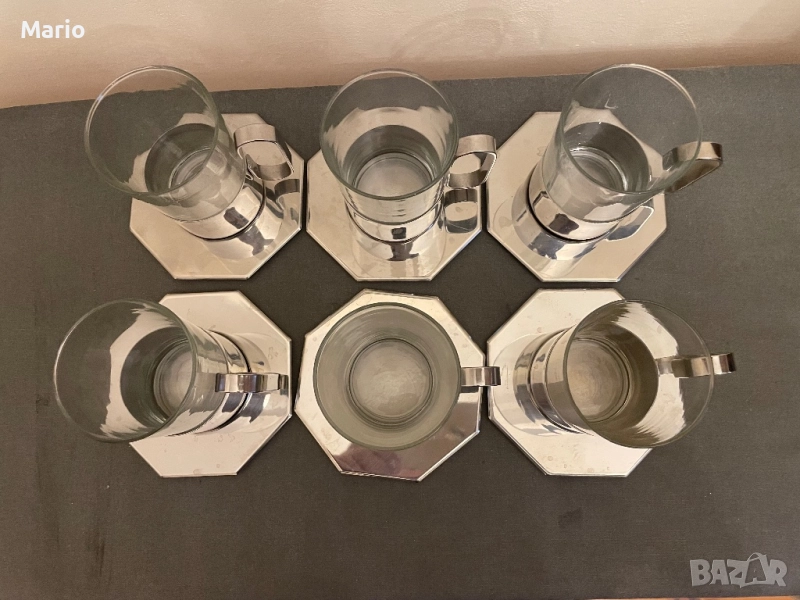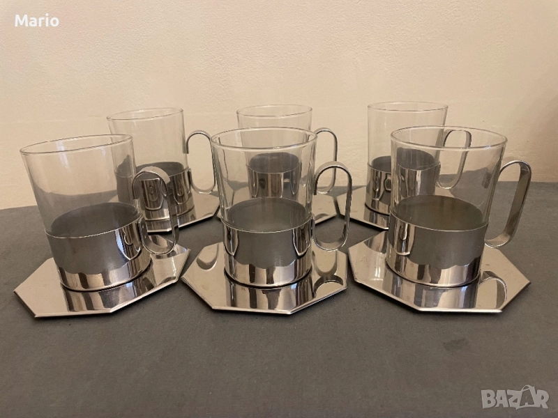 Използван комплект за чай Zepter, състоящ се от 6 чаши с метални поставки. Чашите са изработени от прозрачно стъкло, а поставките са от метал с блестящ хромиран финиш. Комплектът е в добро състояние и може да бъде използван за сервиране на топли напитки.