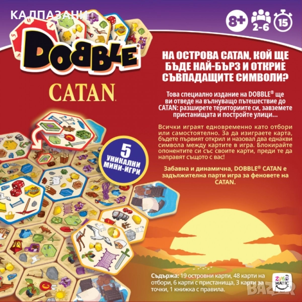 Това специално издание на DOBBLE® ще ви отведе на вълнуващо пътешествие до CATAN: разширете териториите си, завземете пристанищата и постройте улици…