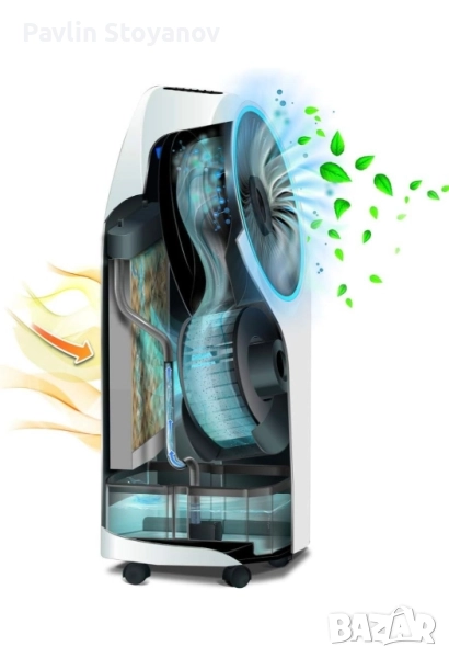 Охладителят работи перфектно,външно без забележки.Има няколко функции,пречиства въздуха,вентилатор с въртене в различни посоки на въздуха и водно охлаждане във вид на водни пари.Има колелца за лесно преместване.
