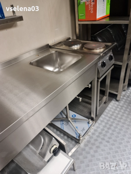 Работна маса база за съдомиялна, фурна скара и др. Чисто нова от неръждаема стомана за всяка професионална кухня. Размера е на една от снимките. Цена за нея-350лв. На втората снимка се вижда как изглежда с уред. Професионалния котлон също се продава цена за него - 450лв.