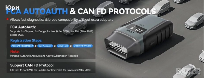 функции. Той също така поддържа по-нови комуникационни протоколи като CAN-FD и FCA AutoAuth (необходим е личен акаунт за AutoAuth и активен абонамент, не са включени в устройството! за модели Chrysler, Dodge, Jeep и Fiat). Това е готов за бъдещето инструмент за автомобилна диагностика, подходящ за домакинства с множество превозни средства или за техници на непълен работен ден. Покритието варира в зависимост от автомобила, моля, първо проверете съвместимостта.