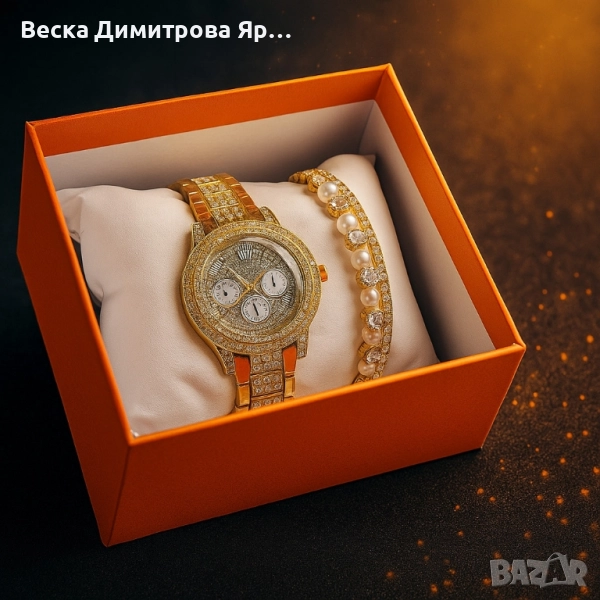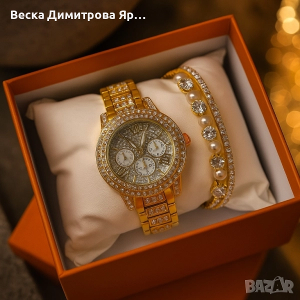Продукт: Дамски комплект часовник + гривна, златист, с кристали, в подаръчна кутия;
