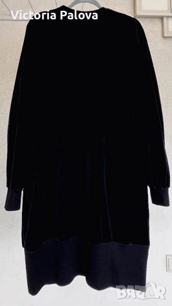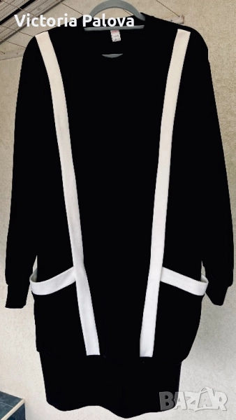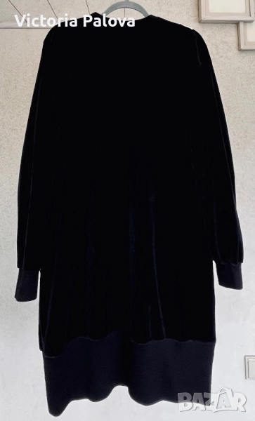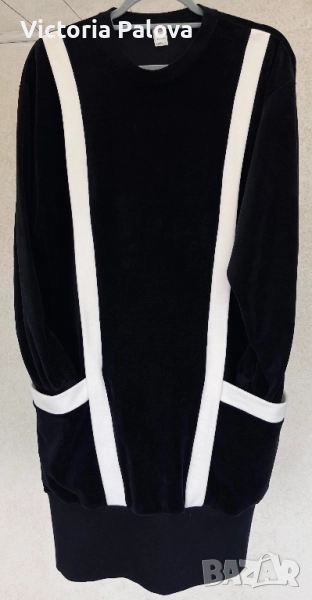 Рокля с изящни бели панели, дълги ръкави и стилни джобове, изработена от луксозна смес - 50% памук, 30% вискоза, 20% полиестер с невероятно мек и топъл плюшен NICKY-PLÜSCH - за комфорт и топлина през есенни и зимни дни. Рамо ( паднало) - 53см, ГО - 57см, дължина - 92см, ръкав - 57см.