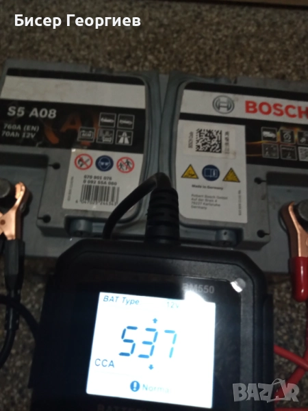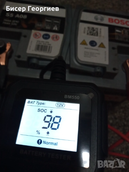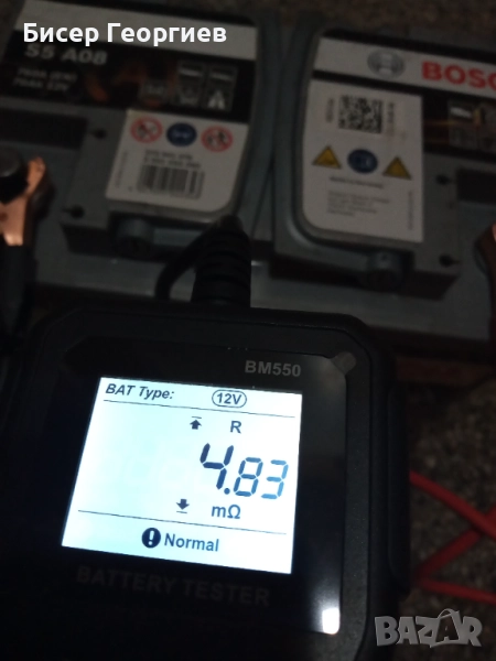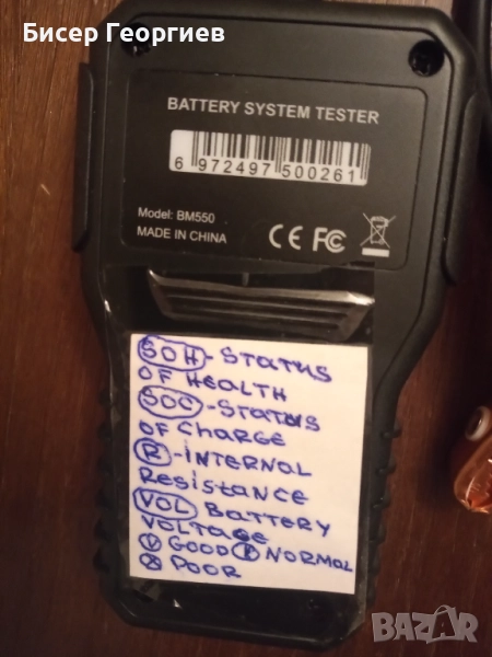 Тестера за акумулатори е : BATTERY TESTER " OBDResource BM 550 " , а легендата от снимките (за тези , които не разбират ) е :