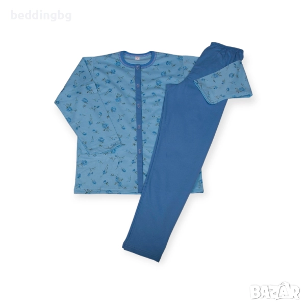 Горна част: С дълъг ръкав и закопчаване с копчета по цялата предна част, което я прави много удобна и практична. Има нежен флорален/цветен десен.