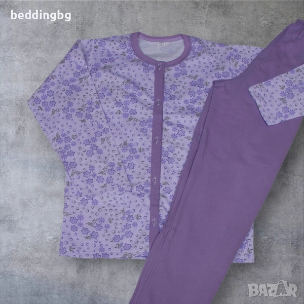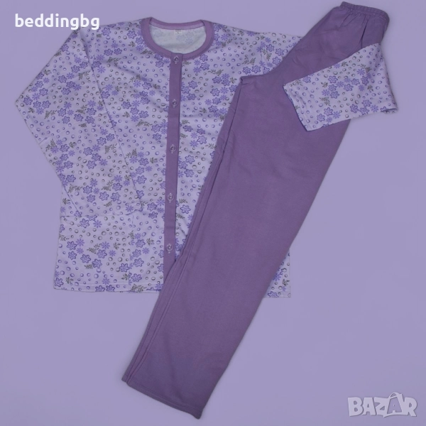 Нежно Лилаво/Лавандула: Горна част с флорален десен в лилави нюанси и едноцветно лилаво долнище.