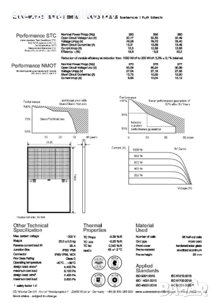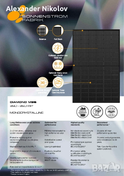 Продавам нови оригинални Соларни панели с мощност 350 Wp произведени в Германия от фирма Sonnenstrom Fabrik. Панелите са много здрави, еднолицеви с двойно антирефлексно стъкло. Тип на клетката монокристална, а рамките и гърба са черни. Продуктът е с високо качество, не се огъва и издържа на по-високи натоварвания от вятър и сняг. Заради размерите е удобен за работа дори и от един човек. Задна страна: прозрачна [balance] | изцяло черна [full black]