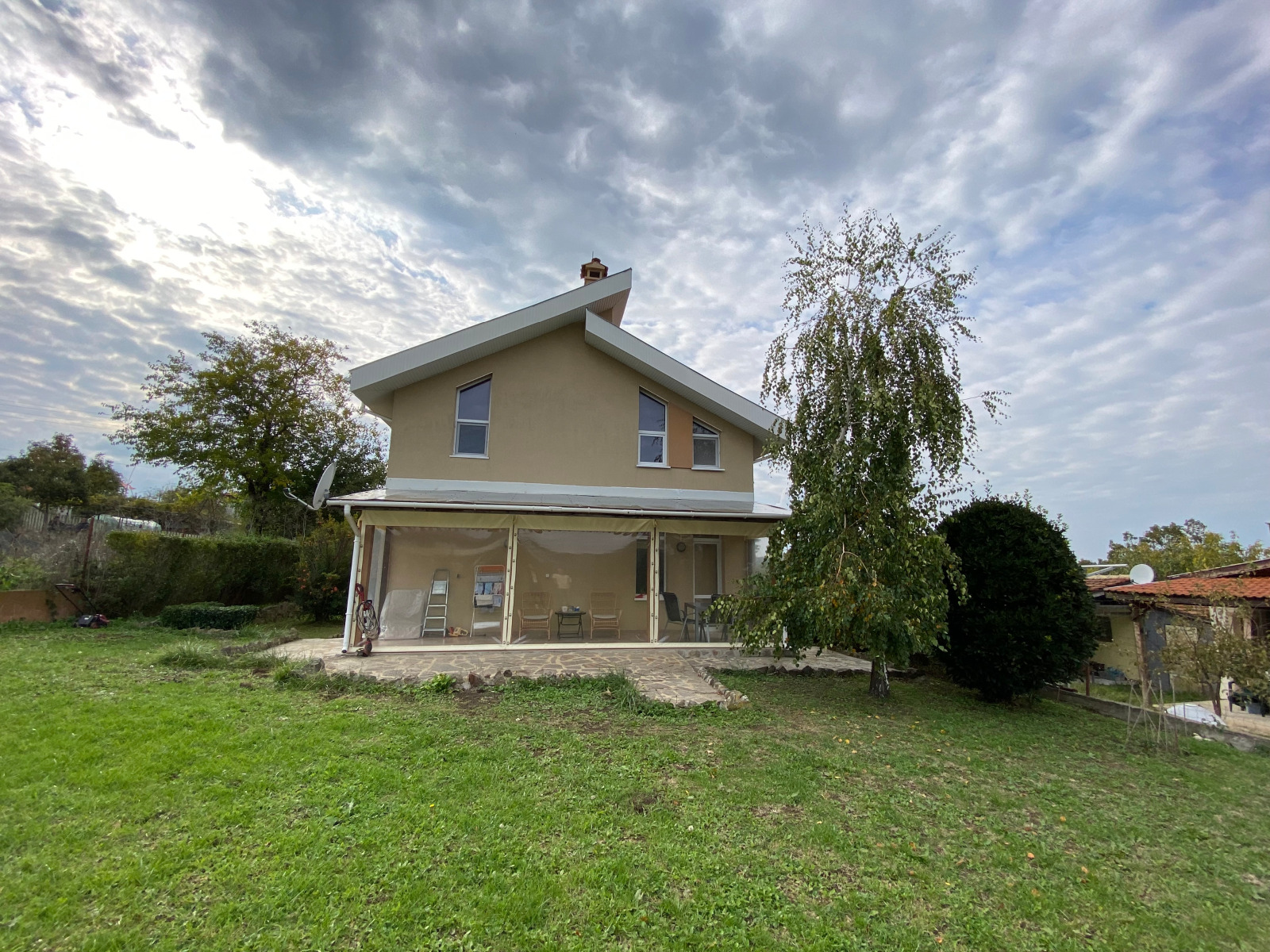 Имотът е с обща застроена площ от 180 кв.м, разположен върху двор с площ от 820 кв.м, красиво озеленен, с възможност за изграждане на басейн, кът за барбекю или цветна градина.