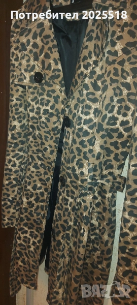 Страхотен шлифер в актуален тигров десен.Състояние отлично,няма скъсано,изтрито,запазено,избеляло.С колан,втален модел подчертаваш талията.Подходящ за есен, пролет и дори зима,ако отивате с кола за събитие.Без следи от носене,с черни копчета.По етикет 40 номер.Дължина над коляното за по-висока жена.Обличано веднъж за повод.