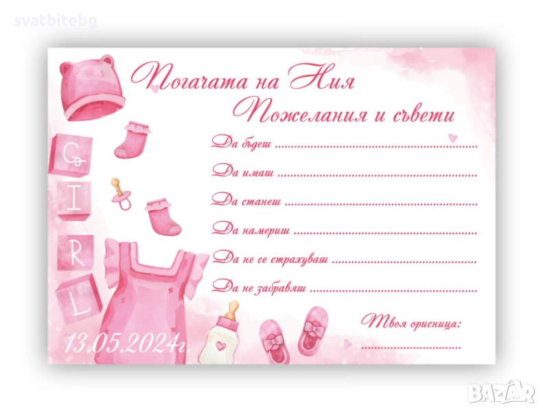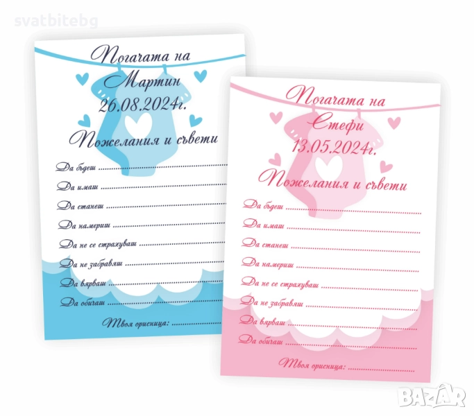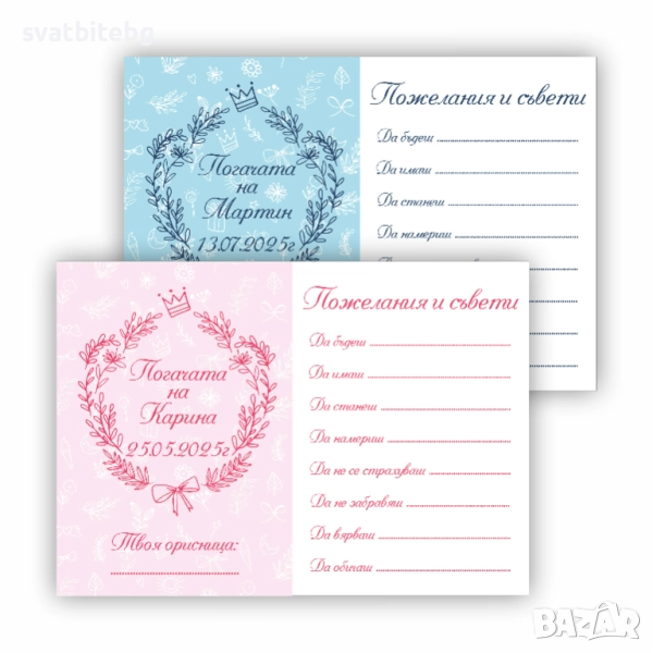 Карти за Наричане: персонализирани, с място за пожелания от гостите. Перфектният начин да съберете всички добри пожелания за здраве, щастие и късмет.