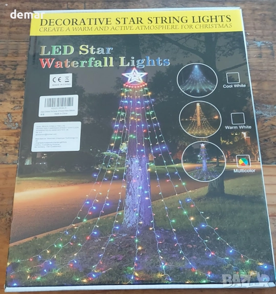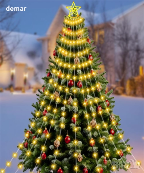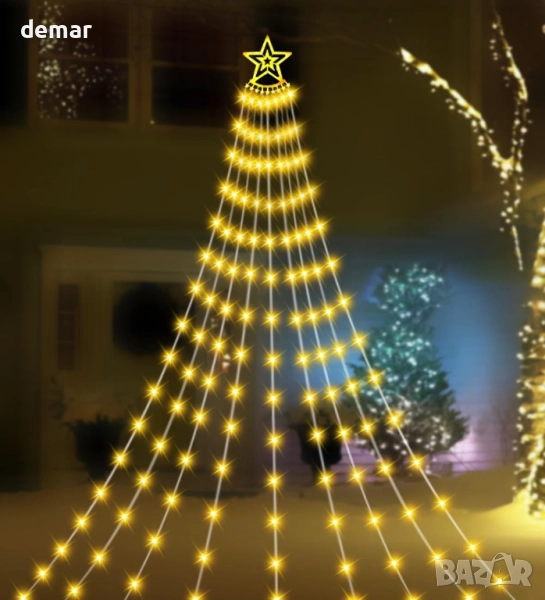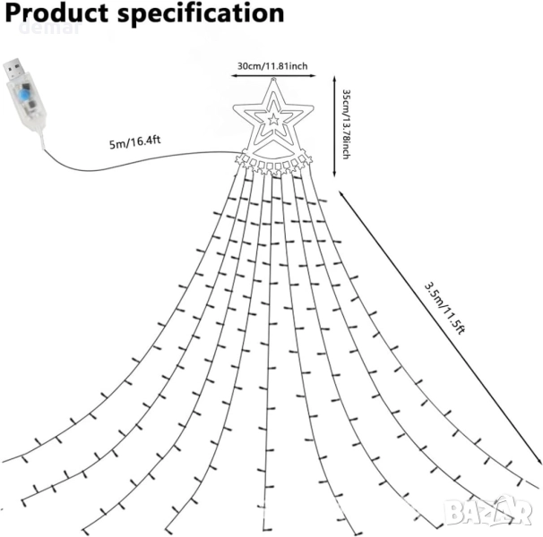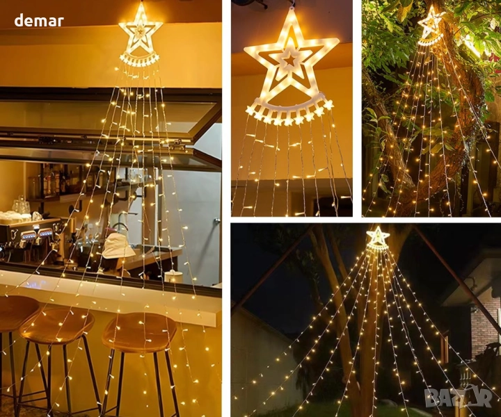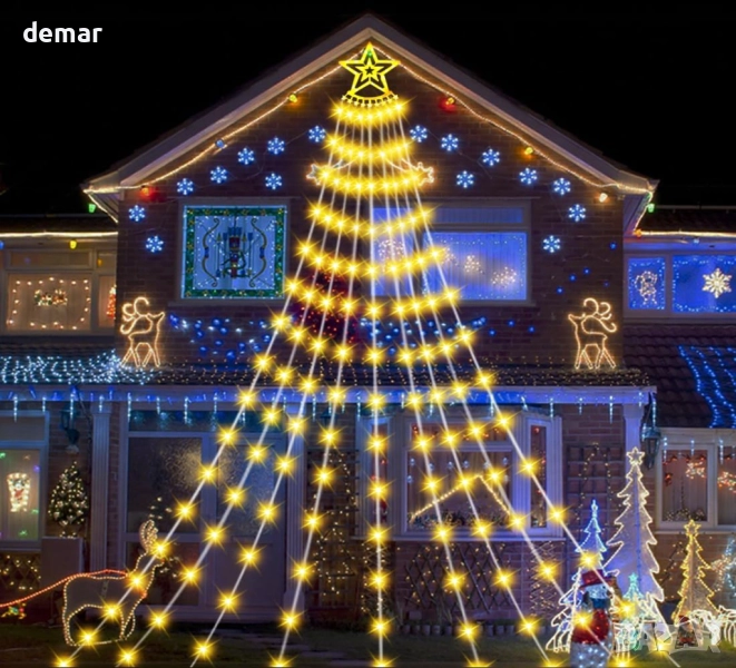Тази LED коледна лампа тип водопад е с голяма светеща петолъчна звезда с 9 каскадни светлинни нишки по 3,5 метра, съдържащи 350 светодиода. Захранва се от USB за лесна настройка и предлага 8 режима на осветление, включително постоянно, мигащо и затихващо, регулируеми с обикновен бутон. Проектирана както за вътрешна, така и за външна употреба, тя красиво украсява дървета, стени, градини, прозорци и вътрешни дворове, добавяйки празничен блясък към всеки повод като Коледа, Нова година, сватби или партита. Дългият ѝ USB кабел 5 метра осигурява гъвкаво поставяне, което я прави универсална и очарователна празнична декорация или грижовен подарък.