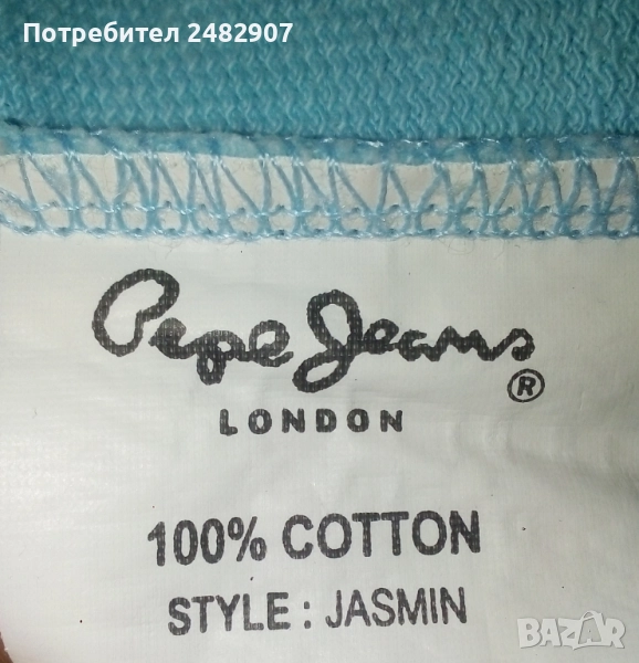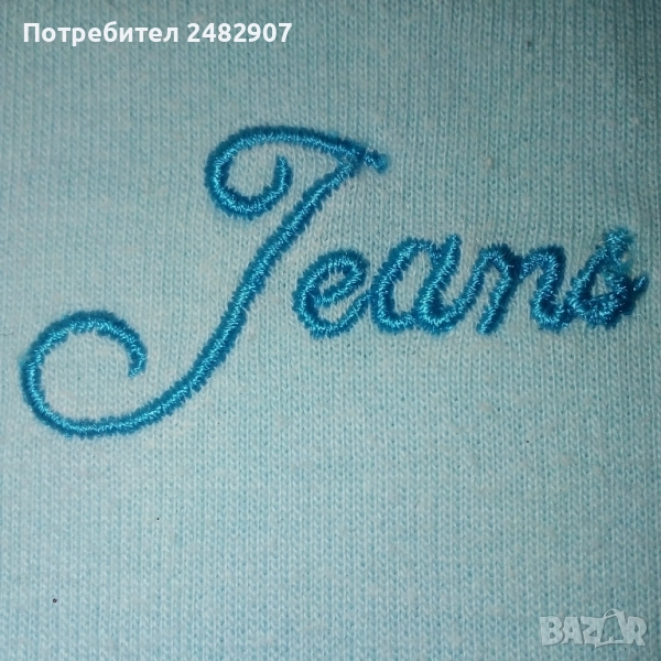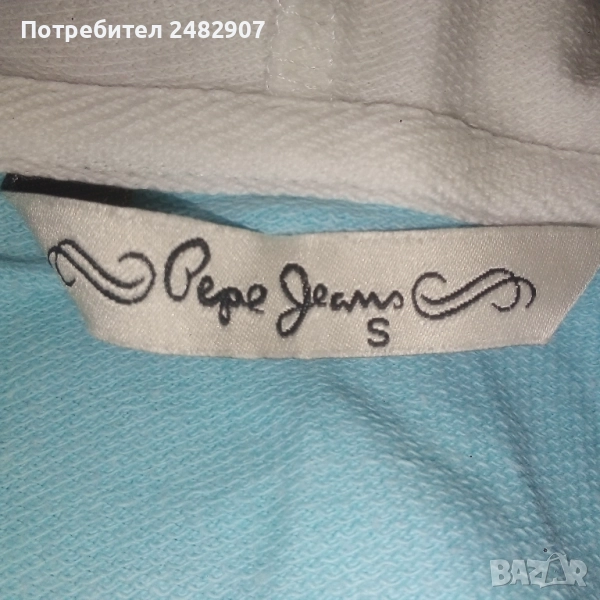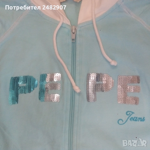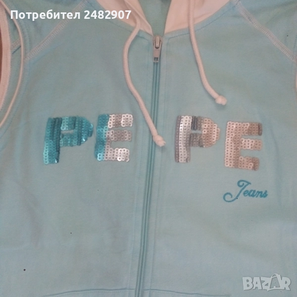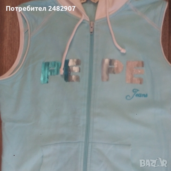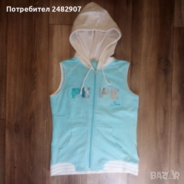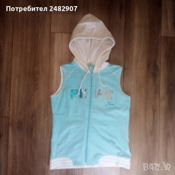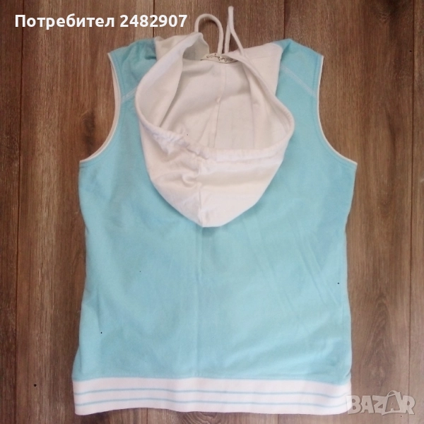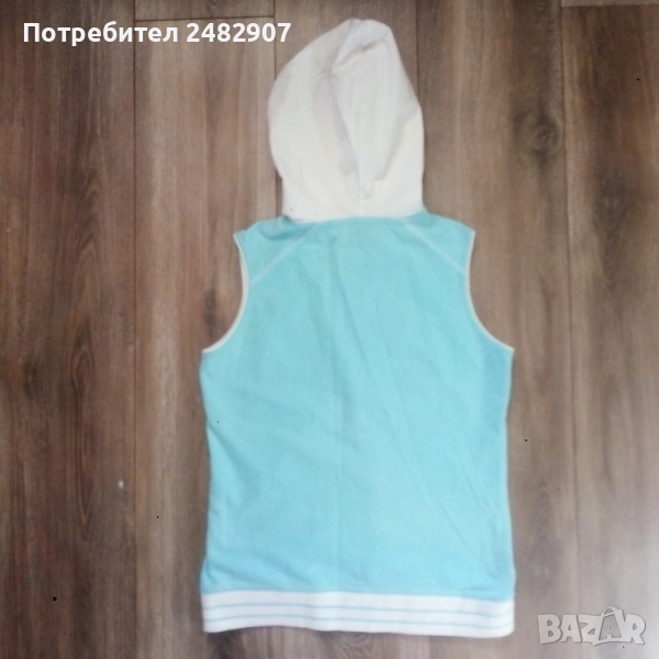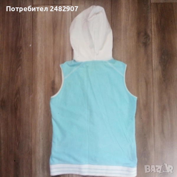 Дамско елече с качулка, два джоба, цип, бродерия и пайети в светло синьо и бяло, размер S. Съдържа 100 % памук. Ширина в раменете - 34 см, ширина под мишниците - 43 см, ширина в долната част - 42 см, дължина от рамото до долу - 56 см. Много запазено, почти не е използвано, без забележки.