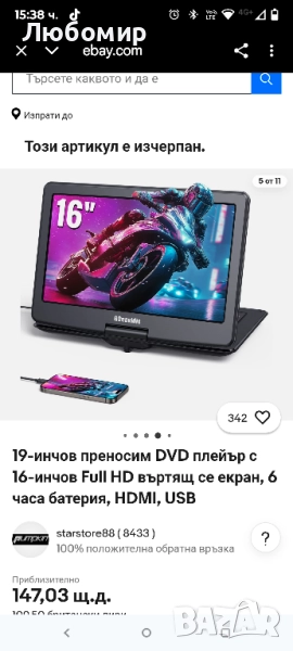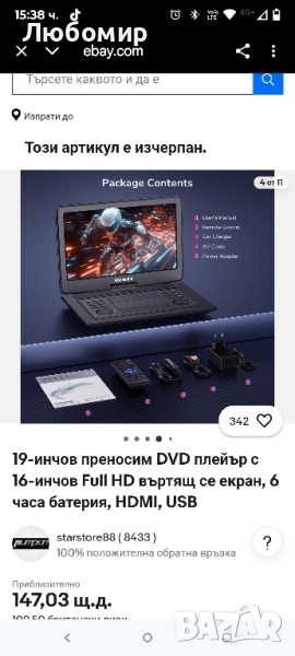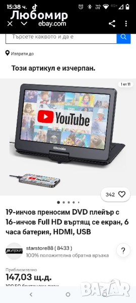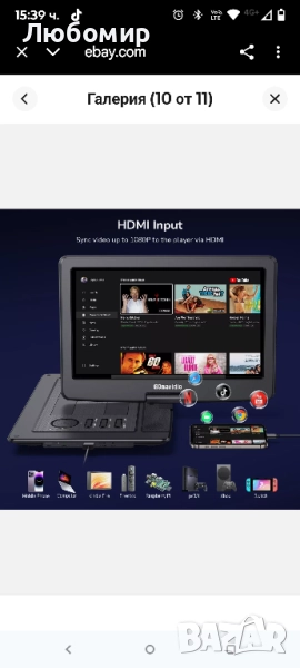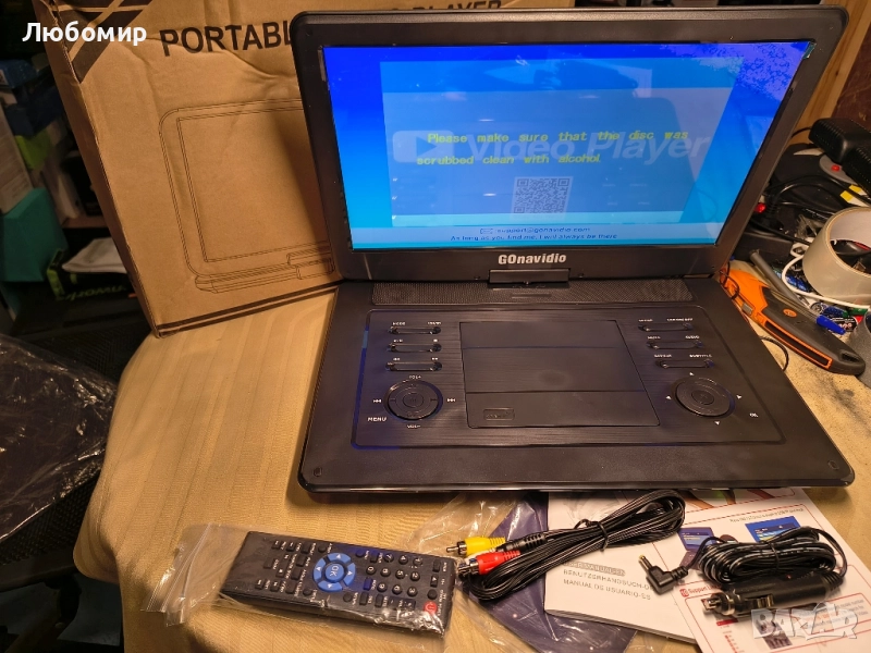 преносим DVD плейър с 15,6" голям HD екран, акумулаторна батерия с живот 5 часа, HDMI