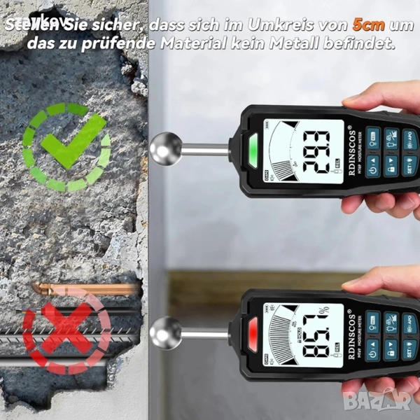 влагомер комбинира сферична сонда за безразрушително измерване на повърхности (0-100, относителни стойности) с влагомер за дървесина с щифтове от неръждаема стомана, за да определи точно съдържанието на влага (%) в дървесина и строителни материали като замазка.