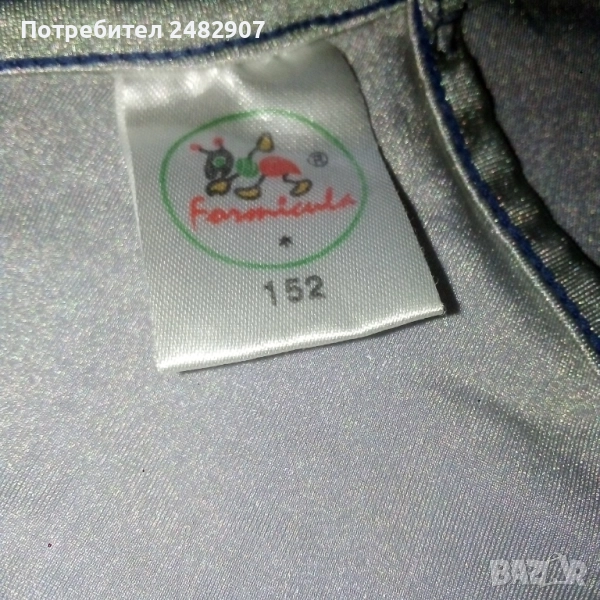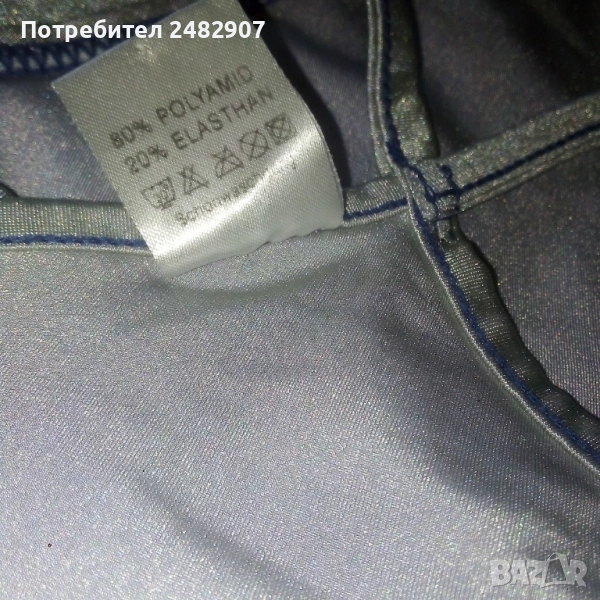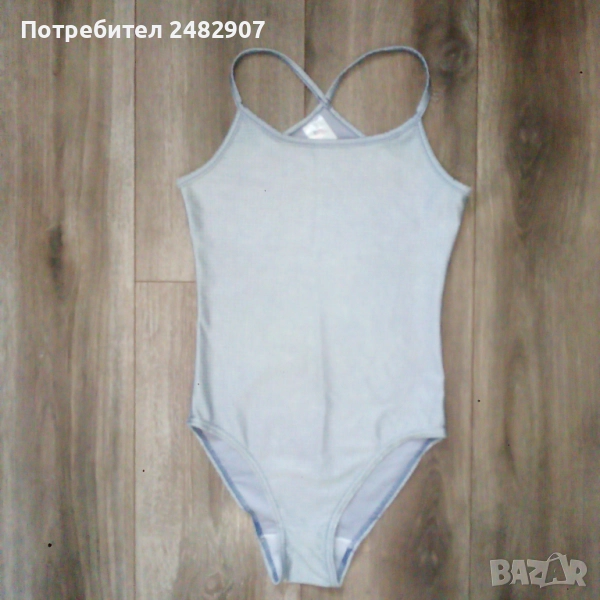 Цял детски бански за момиче в светло синьо и бяло за ръст - 152 см. Съдържа 80 % полиамид и 20 % еластан. Ширина под мишниците - 33 см, ширина в ханша - 30 см, дължина от горната част на презрамките до долу - 62 см. Много запазен, почти не е използван.