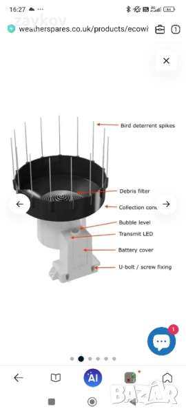 Отделният сензор за дъжд измерва валежите и се самоизпразва за лесна употреба, като включва шипове против птици и метален филтър за отпадъци.