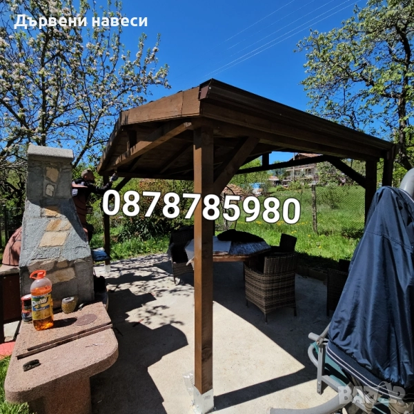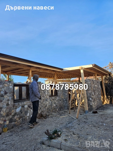 Изграждане на дървени навеси, беседки, барбекюта и гаражи, като целият дървен материал се шлайфа и импенгрира. Гаранция, договор направа на всякакви навеси от дърво, навеси на тераси, гаражни навеси за автомобили, навеси за летни кухни, барбекю и зимни градини от дърво изграждане на всякакъв вид луксозни дървени покривни конструкции изработване на дървени беседки за двора повдигане на тавански стаи ремонт на покриви цялостно конструиране на нови покриви затваряне, покриване, приобщаване и усвояване на тераси и балкони дървени козирки изработка на дървени перголи полагане на хидроизолации по покриви и покривни пространства цялостни ремонти и реновиране на всякакви стари дървени конструкции и фасади комплексно изграждане на дървени бунгала, сервизни помещения (бараки), малки градински постройки от дърво или дървени работилници различни решения за градини и тераси на заведения също от дърво, дървени декорации, дървении, сепарета, облицовки, решетки и др. проектиране и цялостно изграждане на открити външни барове и летни заведения от дървен материал.