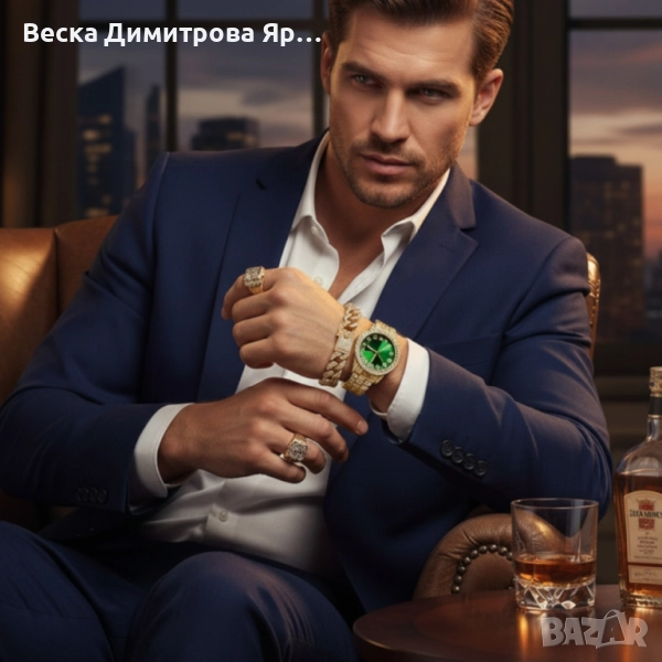 Тип: Кварцов ръчен часовник + кубинска гривна; Механизъм: Кварц; Функции: Час, минута, секунда; дата с увеличителен прозорец; Диаметър на корпуса: 43 мм; Дебелина на корпуса: 10 мм; Материал на корпуса: Метална сплав; Стъкло: Минерално (Hardlex); Каишка/верижка: Метална, ширина 20 мм, скрита закопчалка, дължина ~9″ (≈23 см), регулируема чрез звена; Водоустойчивост: Не е водоустойчив – избягвайте контакт с вода; Гривна: Кубинска верига, ширина 12 мм, дължина ~20 см, инкрустирана с кристали; Цветове на циферблата: Червен, син, жълт (златист), зелен, бял; В комплекта: Часовник, гривна, подаръчна кутия.