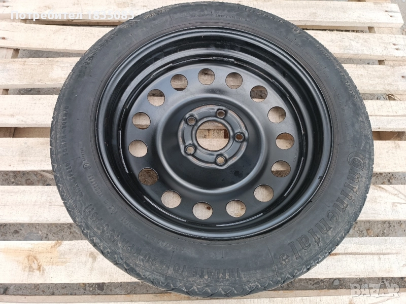 Продавам оригинална резервна гума тип патерица за БМВ с размери 17" 5х120 4J ET18 ЦО72.6мм. с гума Continental 135/80/17.