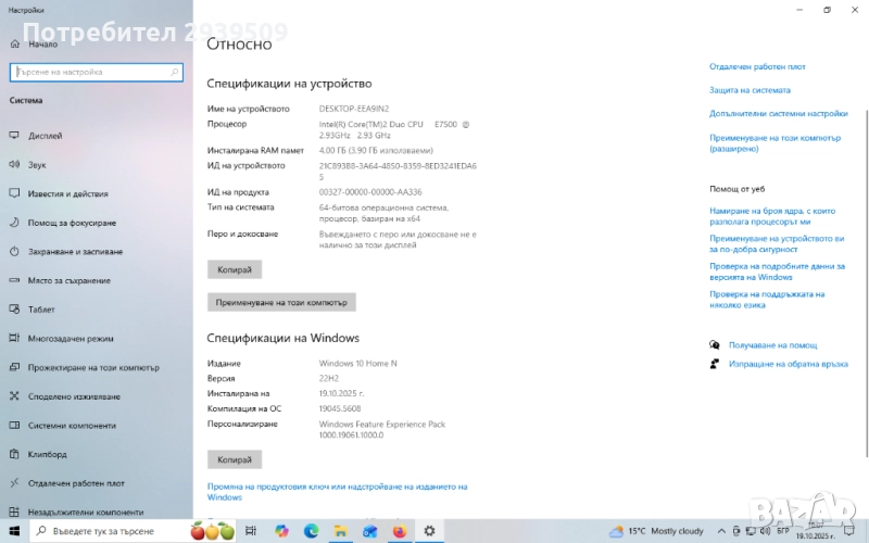 Операционна система Windows 10 Home N + инсталиран пакет Microsoft Office 2016.