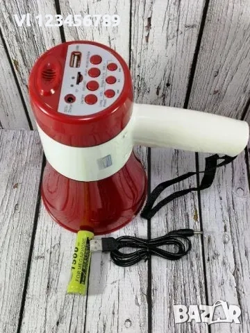 дори и за дълги периоди. Захранван на батерии мегафон с акумулаторна батерия 18650 - 3,7 Волта. Възможност за зареждане на акумулаторната батерия с кабел направо във мегафона, дължина на кабела 85 см. Кабела е със включване в USB 2.0 порт на компютър или адаптер. Възможност за зареждането на батерията и в зарядно, на 220 волта.