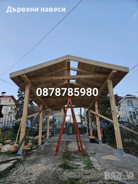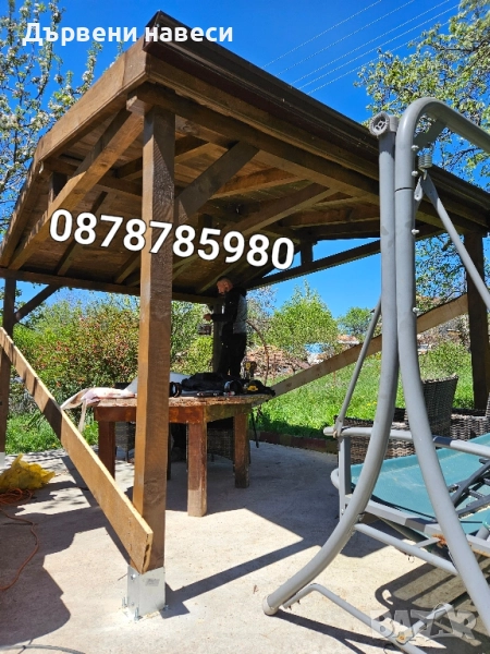 Изграждане на дървени навеси, беседки, барбекюта и гаражи, като целият дървен материал се шлайфа и импенгрира. Гаранция, договор направа на всякакви навеси от дърво, навеси на тераси, гаражни навеси за автомобили, навеси за летни кухни, барбекю и зимни градини от дърво