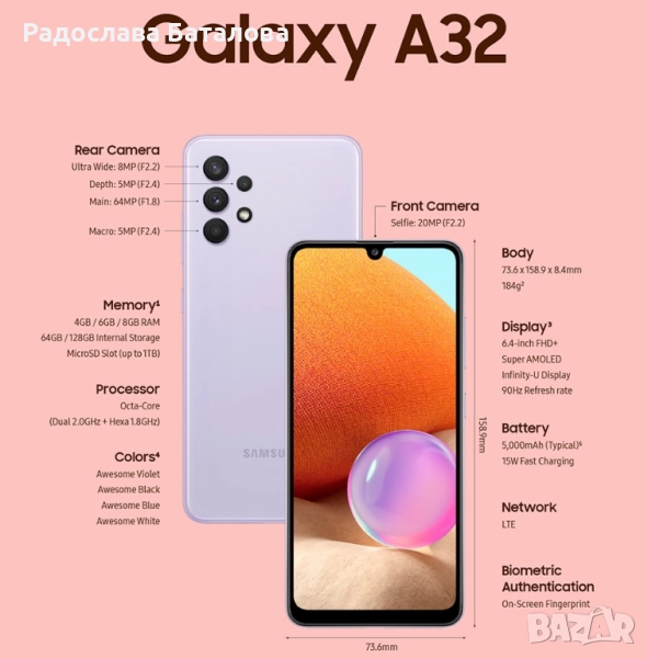 Samsung Galaxy A32 4G В добро състояние телефона е използван малко цвят син подарък два две кейсчета. Серия: Galaxy A32 Брой SIM карти: Dual SIM (Nano-SIM, dual stand-by) Операционна система: Android 11, One UI 3.1 Процесор: Octa-core (2x2.0 GHz Cortex-A75 & 6x1.8 GHz Cortex-A55), Mali-G52 MC2, Mediatek Helio G80 (12 nm) Мрежа: GSM / HSPA / LTE Дисплей, inch: 6.4" (16.26 cm) Резолюция: 2400x1080 Сензорен дисплей: Super AMOLED, 90Hz, 800 nits Памет, GB: 4GB Диско пространство, GB: 128GB Слот за карти: microSDXC (dedicated slot) Максимална памет, GB: up to 1 TB Камера, MP, предна: 20 MP, f/2.2, (wide), Video 1080p@30fps Камера , MP, задна: Quad: 64 MP, f/1.8, 26mm (wide), PDAF, 8 MP, f/2.2, 123?, (ultrawide), 1/4.0", 1.12m, 5 MP, f/2.4, (macro), 5 MP, f/2.4, (depth), Video 1080p@30fps Светкавица: LED flash, panorama, HDR Bluetooth: Bluetooth 5 USB: USB Type-C 2.0, USB On-The-Go Безжична мрежа: Wi-Fi 802.11 a/b/g/n/ac, dual-band, Wi-Fi Direct, hotspot GPS / A-GPS: Да, с A-GPS, GLONASS, BDS, GALILEO MP3 плейър: MP3, M4A, 3GA, AAC, OGG, OGA, WAV, AMR, AWB, FLAC, MID, MIDI, XMF, MXMF, IMY, RTTTL, RTX, OTA MP4 плейър: MP4, M4V, 3GP, 3G2, AVI, FLV, MKV, WEBM FM радио: FM radio, RDS, recording Преглед на документи: Да Сензори: Fingerprint (under display, optical), accelerometer, gyro, proximity, compass Батерия, mAh: Li-Ion 5000 mAh, non-removable Размери (Ш, Д, В), mm: 158.9 x 73.6 x 8.4 mm Тегло, g: 184 g