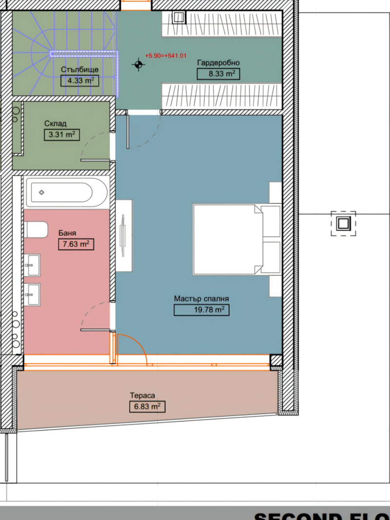 Трети етаж: мастър спалня с гардеробна, голяма баня и склад.