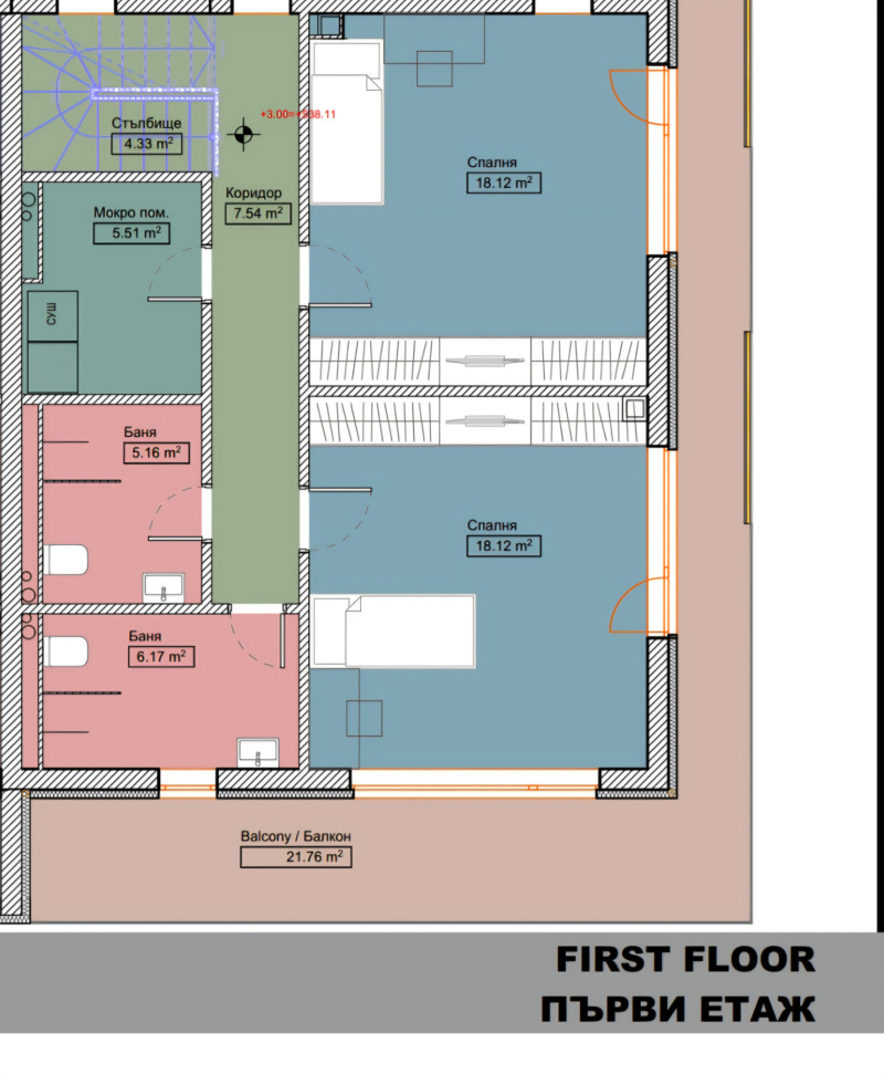 Втори етаж: две спални с две бани, мокро помещение и огромен балкон
