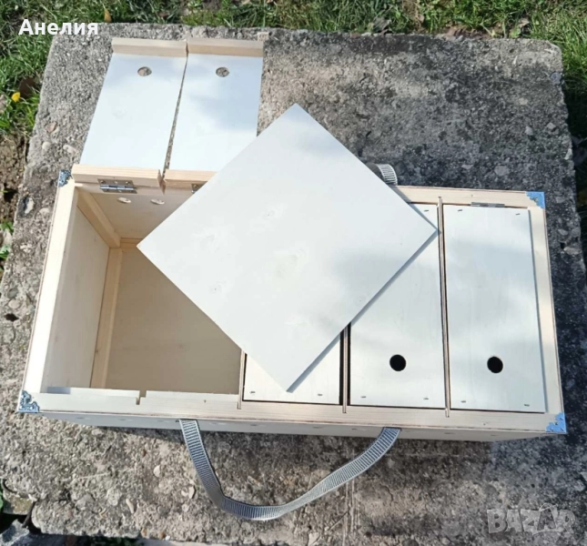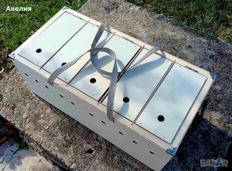 Преноската е предназначена за 5 гълъба.Преградите се махат и става една цяла.Изработена от шперплат топола, което я прави много лека.Има метални ъгли, дръжка.
